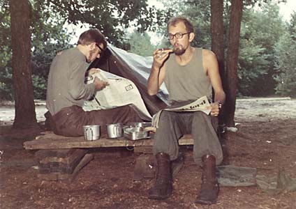 Bivak, september 1969. Maar wel met een stevig ontbijt met de krant! Rechts dienstvriend Onno Jaarsveld.